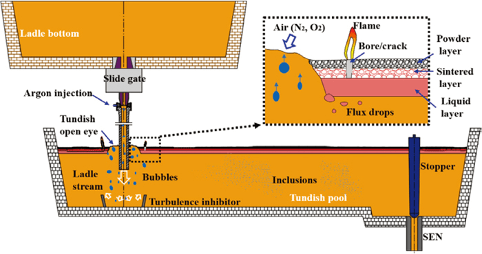 Once the steel passes through the shroud, it enters the tundish – a shallow refractory basin. If the steel surface in the tundish is open to air (often called an “open eye”), re-oxidation can occur at the meniscus or by air entrainment into the flow. Thus modern tundish practice also employs covers and seals on the tundish itself.